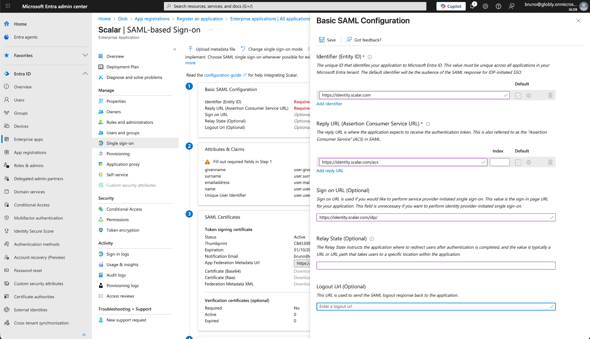 Configure SAML-based SSO between Microsoft Entra ID and Scalar.