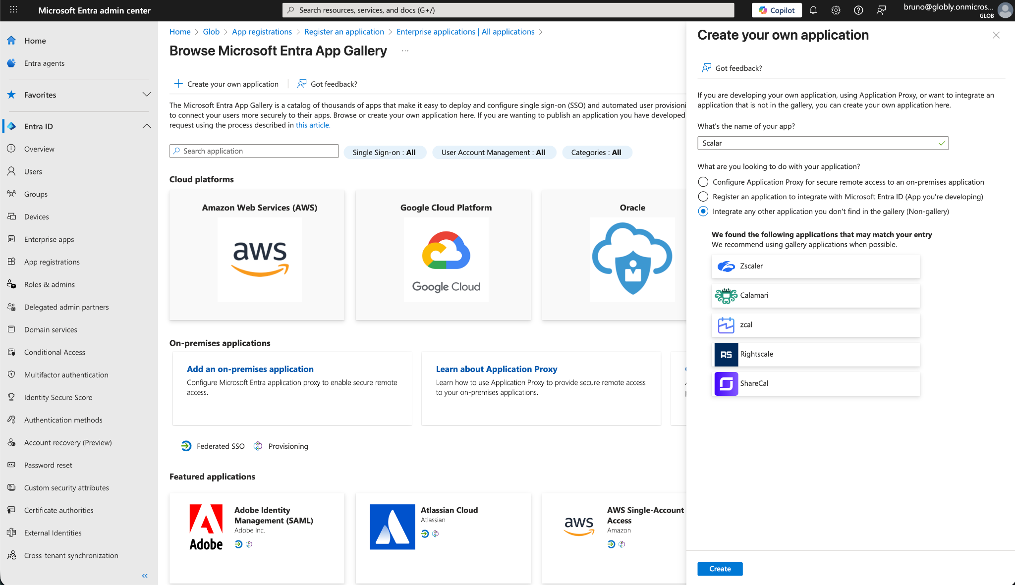 Navigate to Enterprise applications in the Microsoft Entra ID sidebar and select New application. Choose Create your own application and enter a name (e.g., "Scalar"):