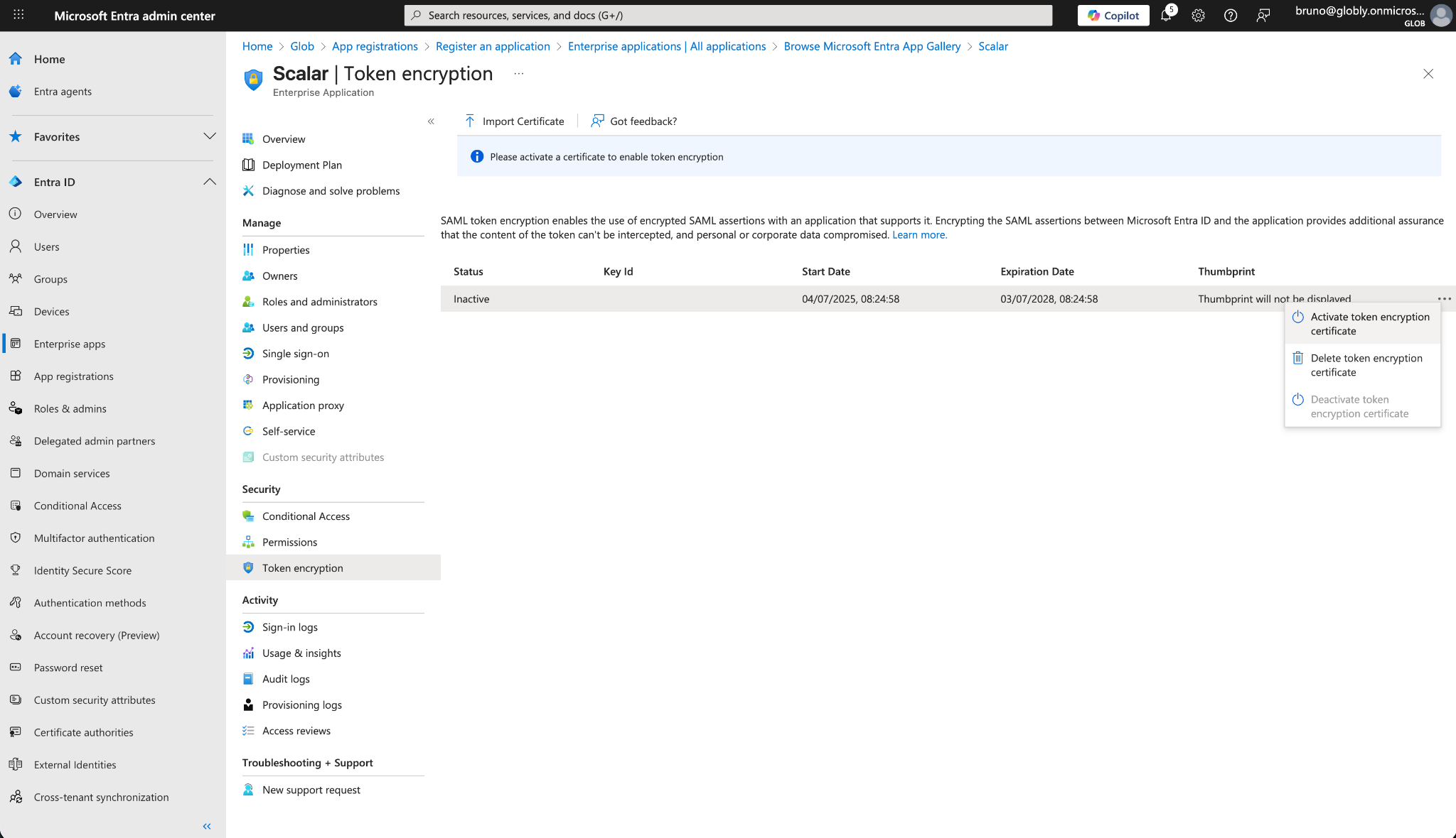 Scalar requires token encryption for SAML assertions. Download the encryption certificate from the Scalar and import it into Microsoft Entra ID under Token encryption: